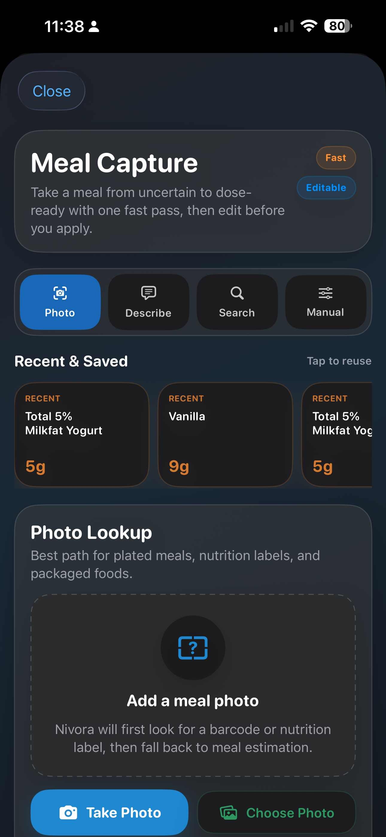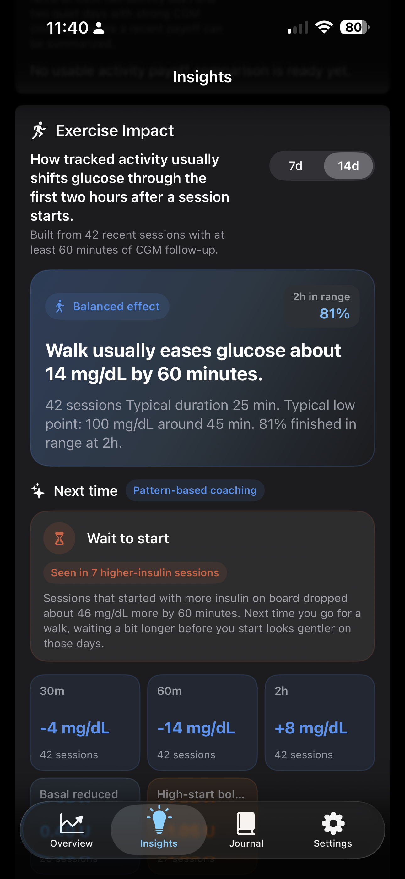 A private iPhone and Apple Watch product built to turn live therapy context into forward-looking, reviewable decisions around meals, corrections, and exercise.